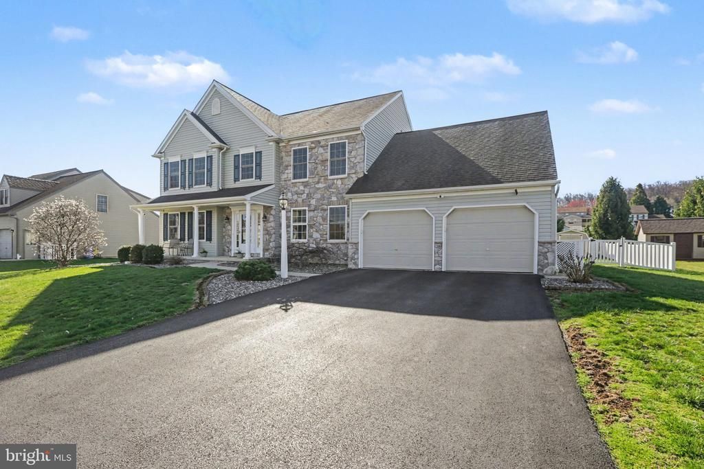 Living large in Eagle's View! Built by EG Stoltzfus in 2013 with extra bump-outs and a fully finished basement, this home has it all! Enjoy close proximity to commuter routes, shopping, and restaurants while living tucked away in a walkable neighborhood. The property backs up to green space owned by the township, but you will have plenty of privacy with the mature evergreens at the property line. Step into the entry way and to find the dining room on the right, powder room and kitchen directly in front of you, and the den on the left. Connecting the dining room and den is the family room with a gas fireplace for cozy winter evenings and plenty of space for your sectional sofa. Scope out the granite countertops in the kitchen with an island that seats four (stools convey), plenty of cupboard space, a gas stove, and easy access to the two-car garage and main level laundry room. The lower level is almost fully finished with a large dry bar, a powder room, and tons of space for whatever activities you enjoy. On the upper level, you will find four spacious bedrooms (3 with walk-in closets), including a primary bedroom with its own bathroom that provides a step-in shower. Tour the fenced backyard with its inviting saltwater pool, stamped concrete patio, storage shed, and covered pavilion. With more square footage than is typical of this development, you will have plenty of space to spread out and enjoy the best that Eagle’s View has to offer.